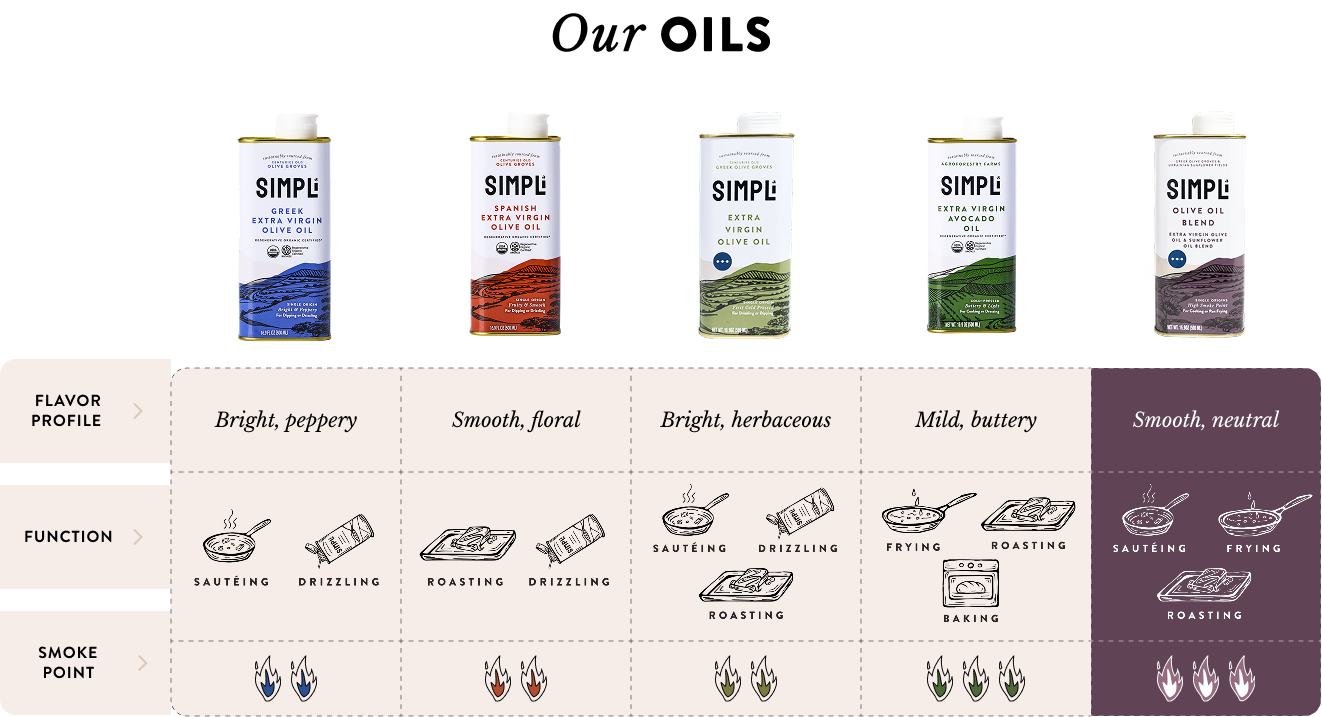 So what’s in the blend? Specifically crafted for cooking, this blend integrates our finest Extra Virgin Olive Oil from Sparta, Greece, with High Oleic Sunflower Oil from Poltava, Ukraine. And we create our blend in-house in the United States, so we have true traceability and quality control over the finished product.